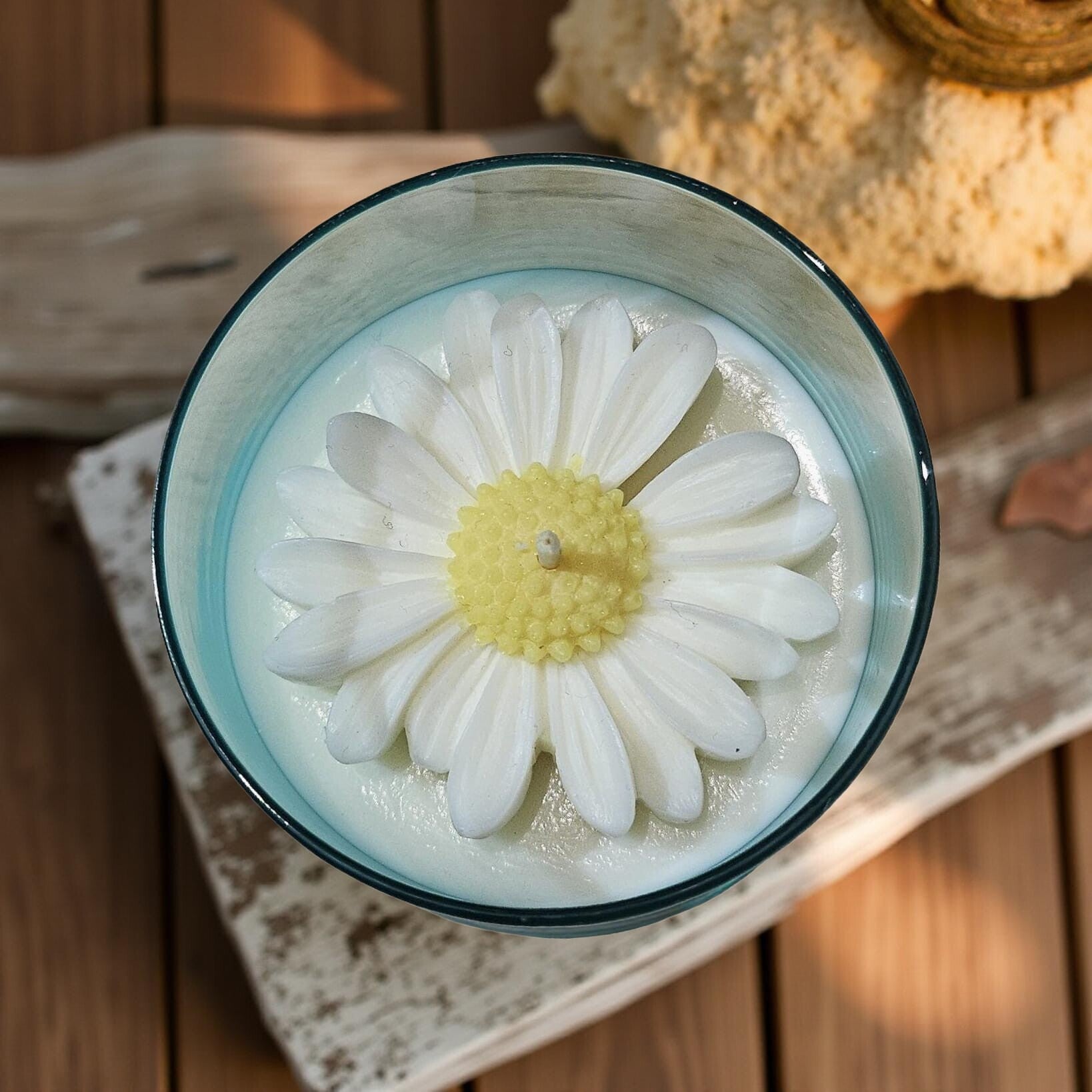 Madeliefje – Turquoise is een handgemaakte potkaars met een zachte, frisse uitstraling.
